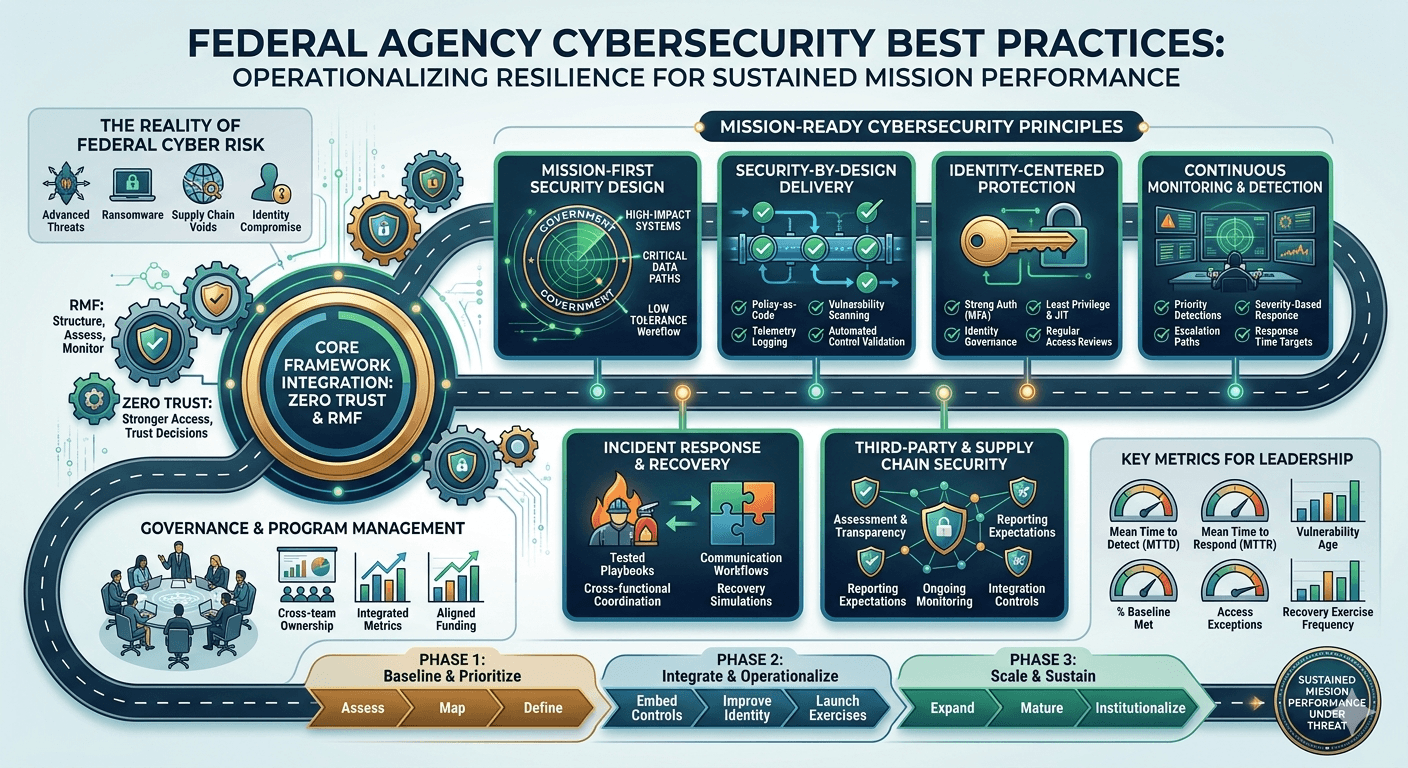 Cybersecurity for federal agencies focuses on protecting mission-critical systems from evolving threats through a proactive, continuous approach. By integrating security into system design, strengthening identity controls, and enabling real-time monitoring and response, agencies can improve resilience, reduce risks, and maintain operational continuity.