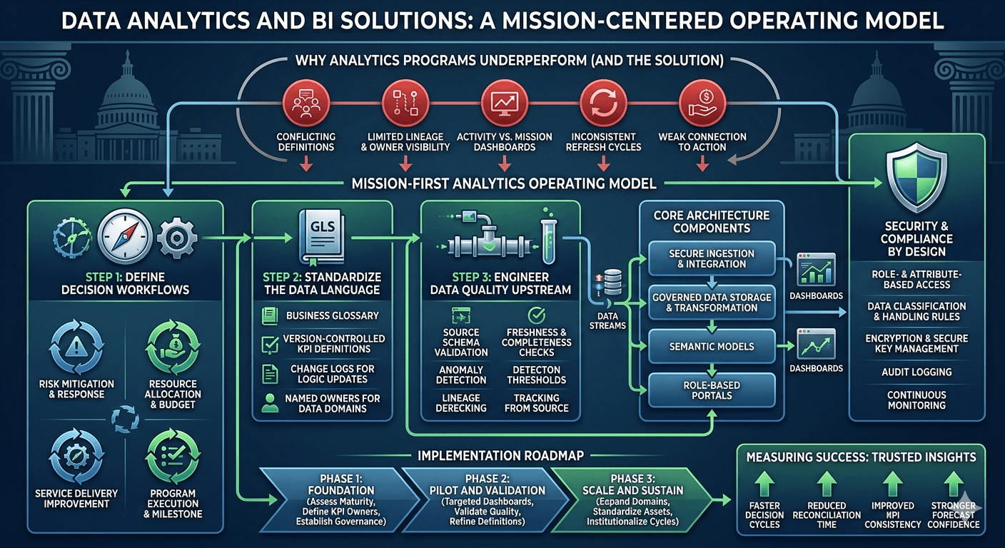 Data analytics and business intelligence enable organizations to transform large volumes of data into actionable insights that support smarter decision-making. By focusing on strong data governance, quality, and standardized metrics, agencies can eliminate inconsistencies and improve trust in their data. A mission-driven approach ensures that analytics directly supports operational goals rather than just generating reports. This leads to faster decisions, better performance tracking, and improved overall efficiency.